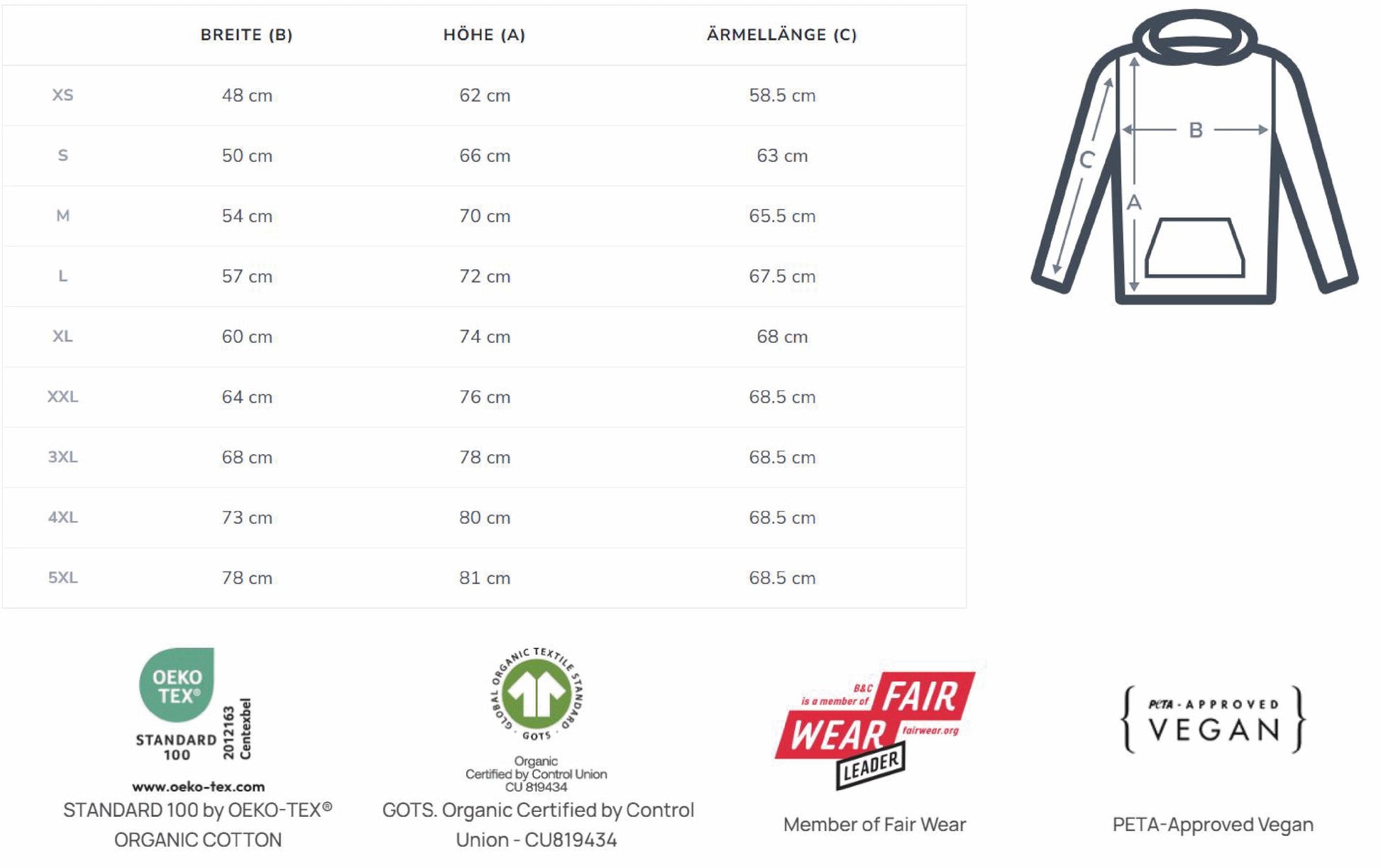 Oberstoff: 85 % Bio-Baumwolle, 15 % recyceltes Polyester